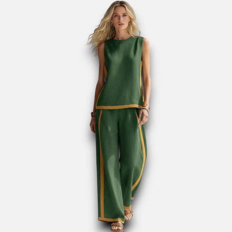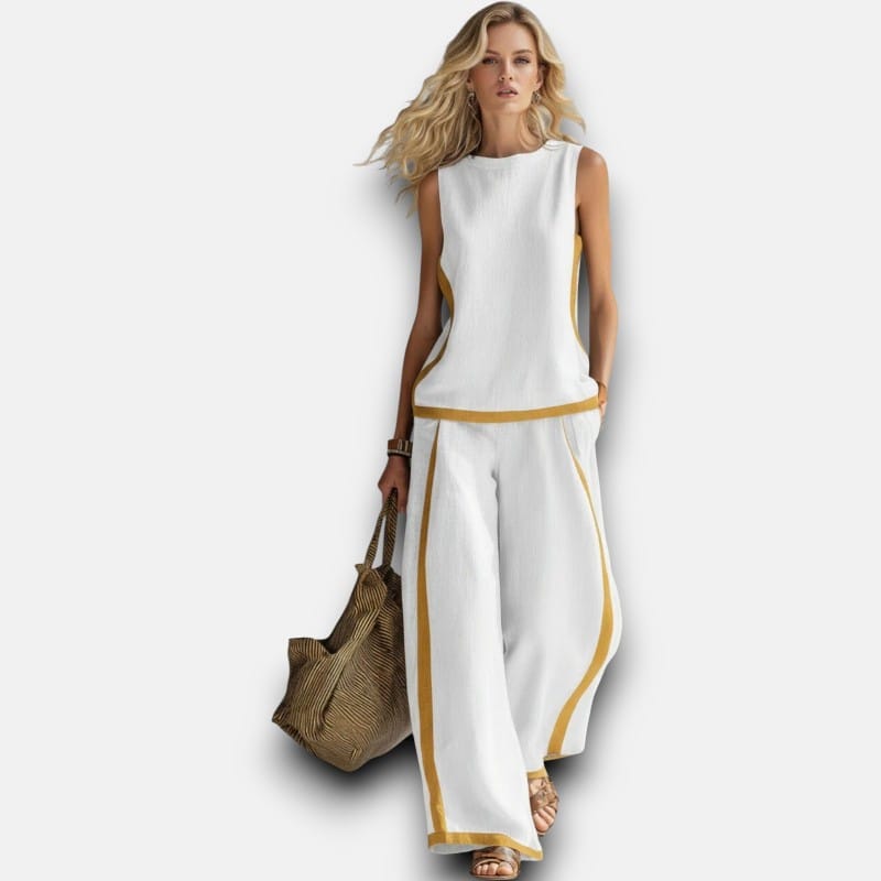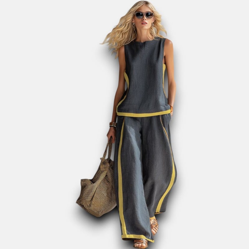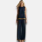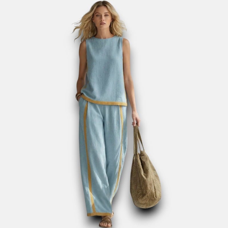 The matching set you'll actually wear. Premium cotton-linen tank and wide-leg trousers with subtle contrast trim that adds structure and visual interest. No need to think about what goes together—this set does the work for you. The relaxed fit flatters without clinging, the breathable fabric keeps you comfortable, and the timeless design means you'll wear it season after season. This is easy dressing that looks expensive.
